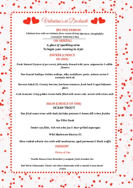 Celebrate love this Valentine’s Day with an intimate three-course dining experience, thoughtfully curated to delight the senses. Enjoy elegant flavors, premium ingredients, and a romantic waterfront ambiance—perfect for a memorable evening together.